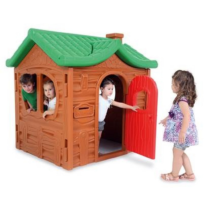 Casinha temática Chalé da montanha, com textura simulando madeira. Na parte interna tem texturas que simulam uma lareira, um relógio e um armário. Com chaminé, janela abre e fecha e caixa de correio. De fácil montagem e desmontagem, dispensa o uso de ferramentas.