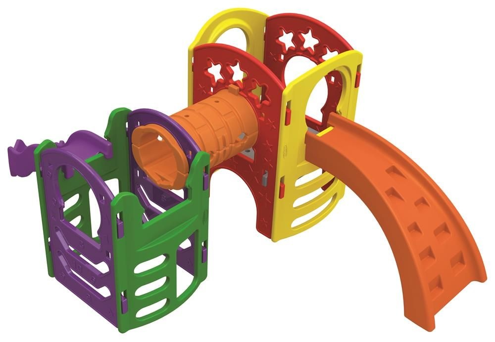 Composto de uma base e quatro paredes com configurações diferentes,um escorregador em curva e um escalador.